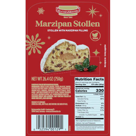 Founded in 1884 by master baker Julius Trockels in Soest, Germany, Kuchenmeister is one of Germany's highest quality baked goods companies. Their stollen are some of the best tasting winter holiday treats you can find. Full of delicious almond marzipan and raisin filling and dusted by fine confectioners sugar - 750 grams of a true family treat.