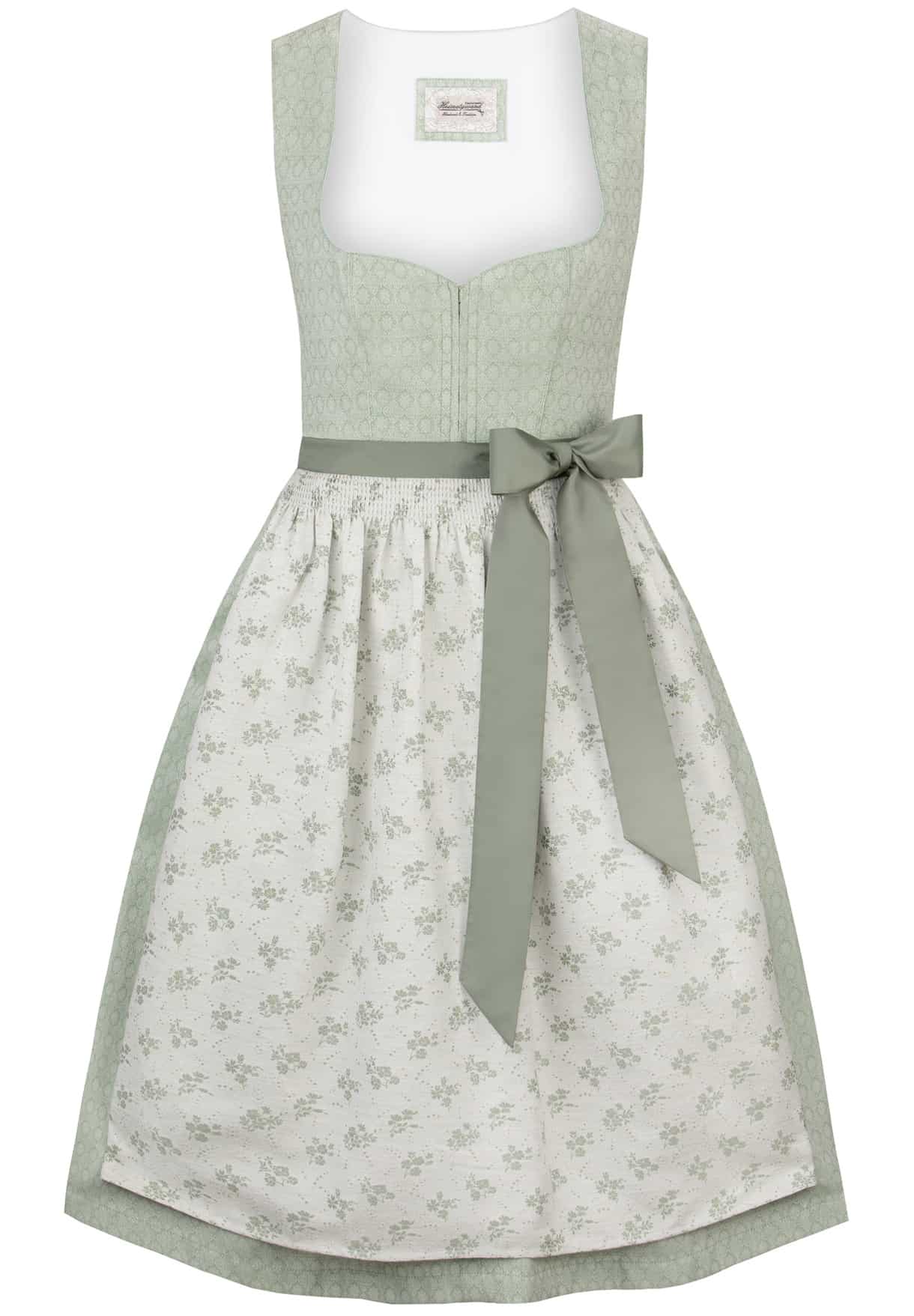 Dirndl Angelina by Heimatgwand in sage. A charming eye-catcher! The simple charm of this dirndl captivates at first glance. The high-quality jacquard fabric, harmoniously combined with a floral and perfectly coordinated apron, lends the outfit a feminine and summery character. The bodice in the traditional Munich cut creates a dreamy décolleté and closes discreetly with a zipper. This dirndl is an absolute must-have for the style-conscious traditional costume lover. Our model wears the dirndl with the Romi bodysuit in cream.