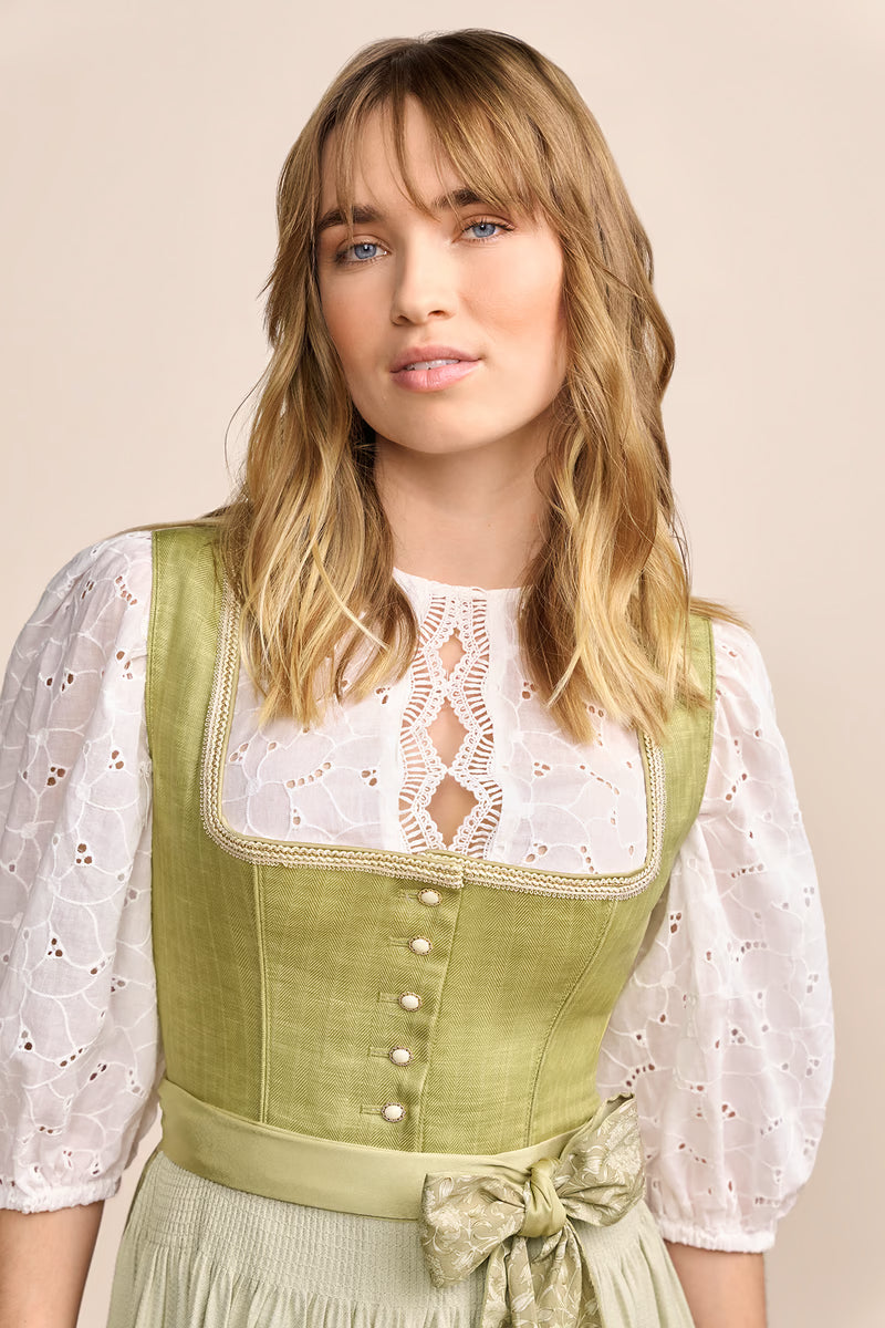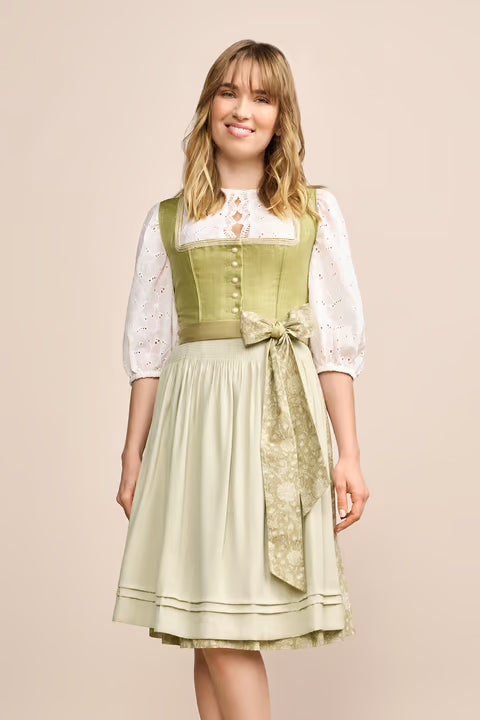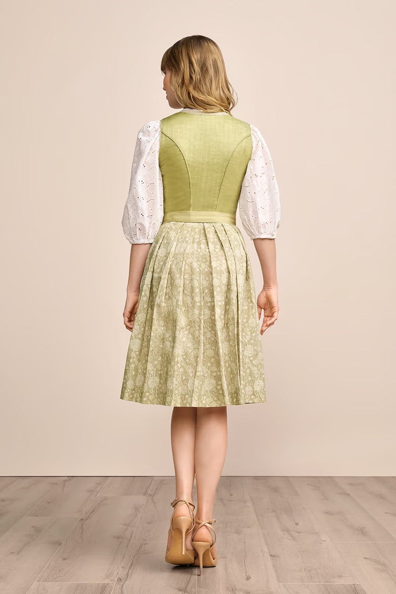 The Lemonie dirndl combines traditional elements with modern details to create a harmonious and stylish design. Classic cuts and playful patterns lend it a timeless charm. The straight neckline with delicate swirls underscores the dirndl's elegant effect. The simple bodice with a practical button placket adds subtle yet striking accents. The skirt is adorned with delicate scattered flowers, while the solid-colored apron is simple yet sophisticated, completing the overall look. As part of our current MADL collection, the Lemonie dirndl is a must-have for anyone who wants to wear traditional dress with style and individuality!