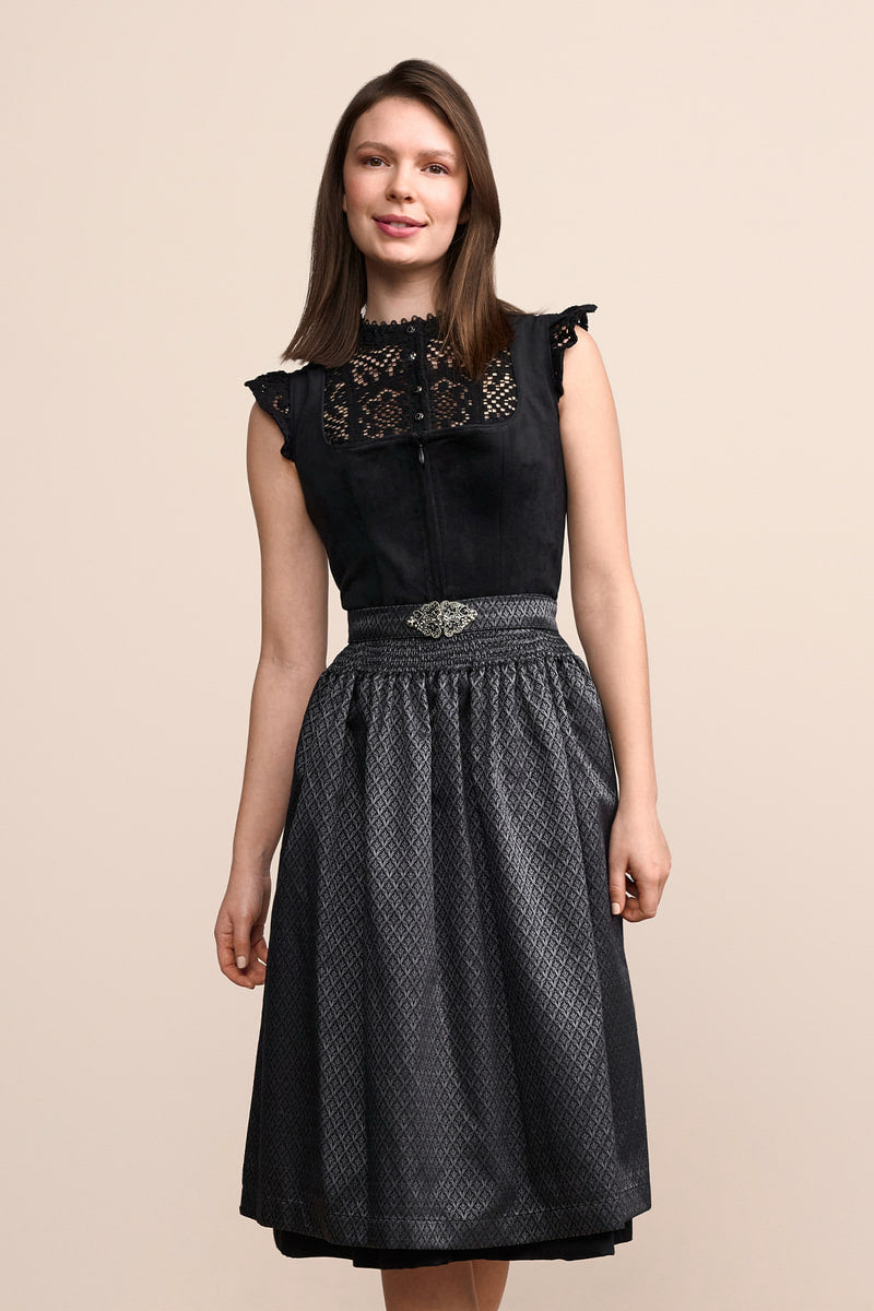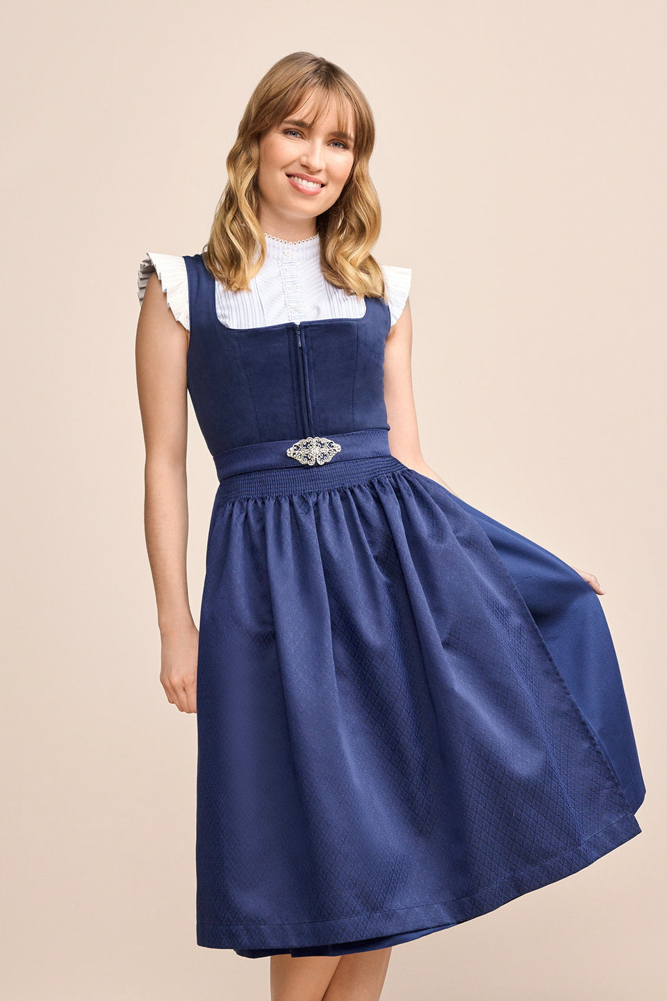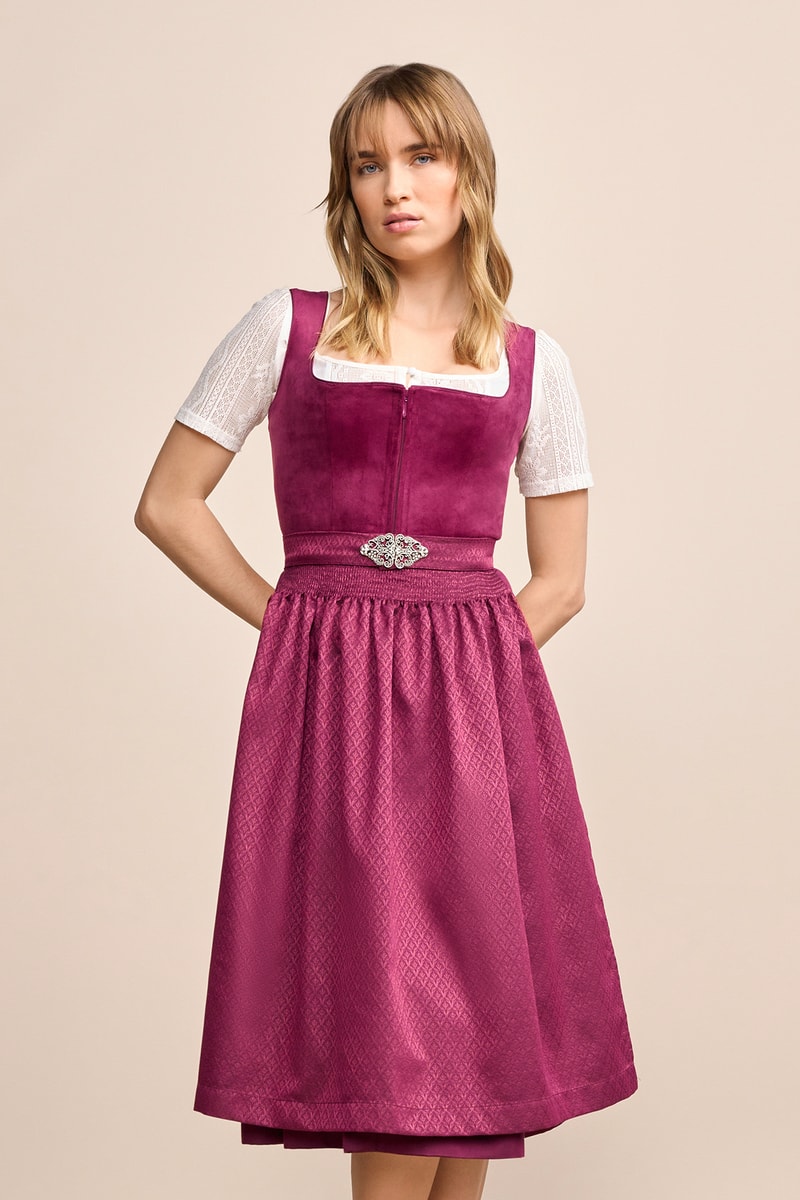 Elegant velvet dirndl Alisha from our MADL collection. The plain velvet bodice with its straight neckline gives this dirndl a timeless charm. A real highlight is the skirt with its delicate ornamental pattern and pretty buckle. The dirndl closes with a zipper on the front. The 70cm skirt ends below the knee. Our Alisha dirndl is perfect for all traditional costume lovers.