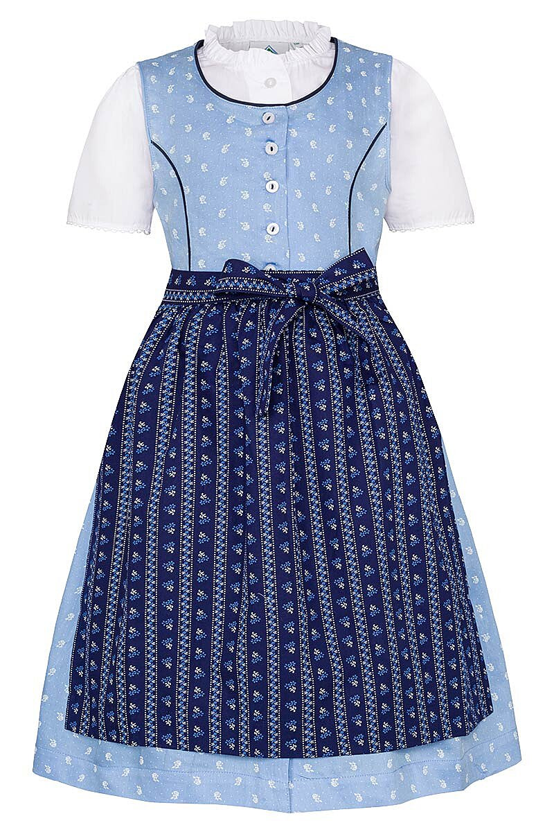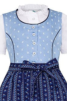 The top, with its traditional Viennese seam, and the skirt are decorated with a pretty floral pattern. The neckline and Viennese seams are accentuated by dark blue piping. The button placket with mother-of-pearl buttons, which fastens the dirndl, creates a particularly elegant effect.