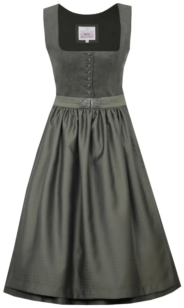 The elegant Osterhofen dirndl by MarJo is designed in beautiful olive tones. The corduroy top fastens with color-coordinated fabric buttons, and the same fabric is used for the edging. The skirt is classically pleated, finely patterned, and features practical pockets. The striped apron is also olive green and fastens with a silver clasp. Like all MarJo dirndls, the Osterhofen dirndl has enough fabric on the sides to make it a size larger or smaller. Photo by Marjo. Item number: 933275-020057