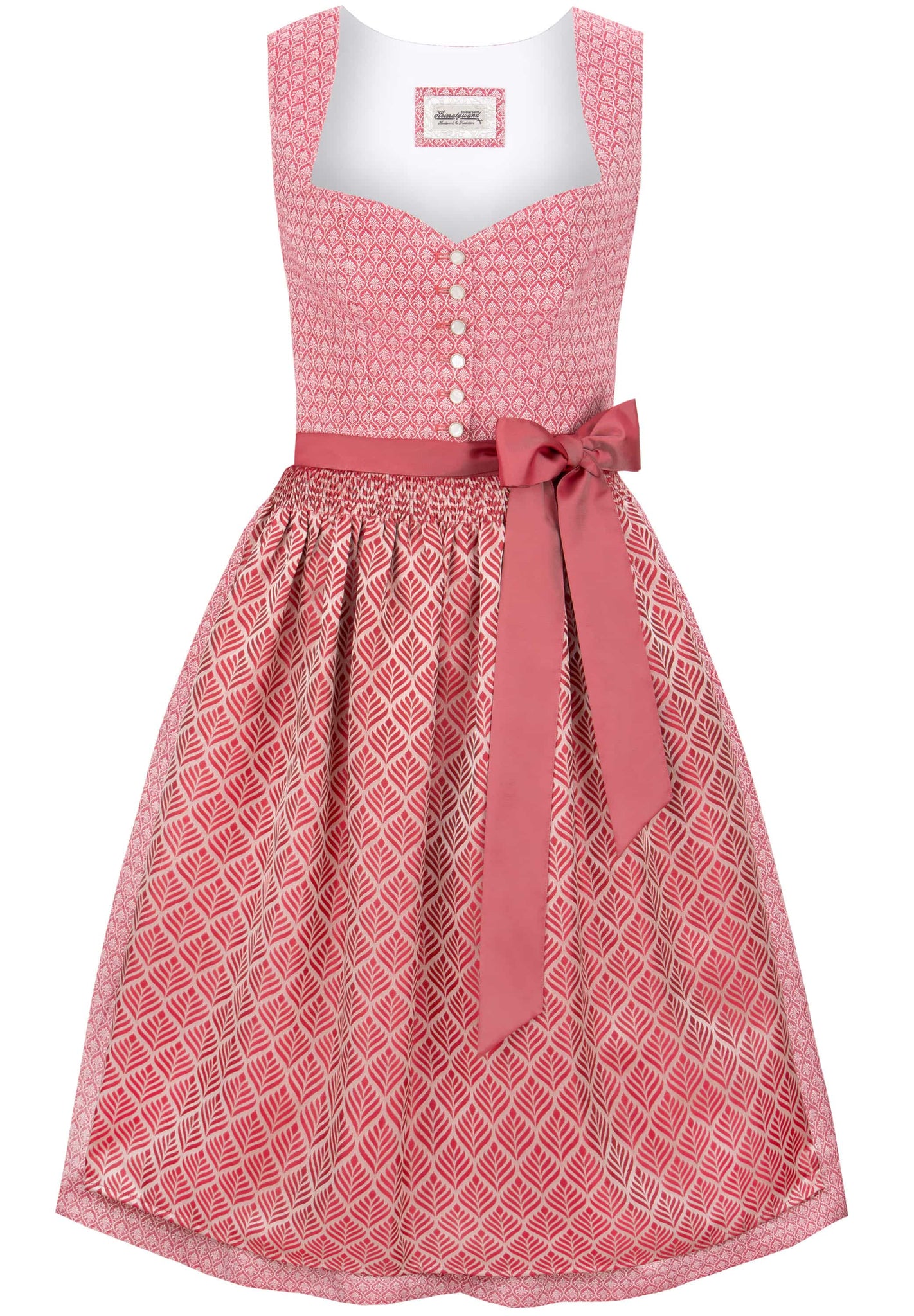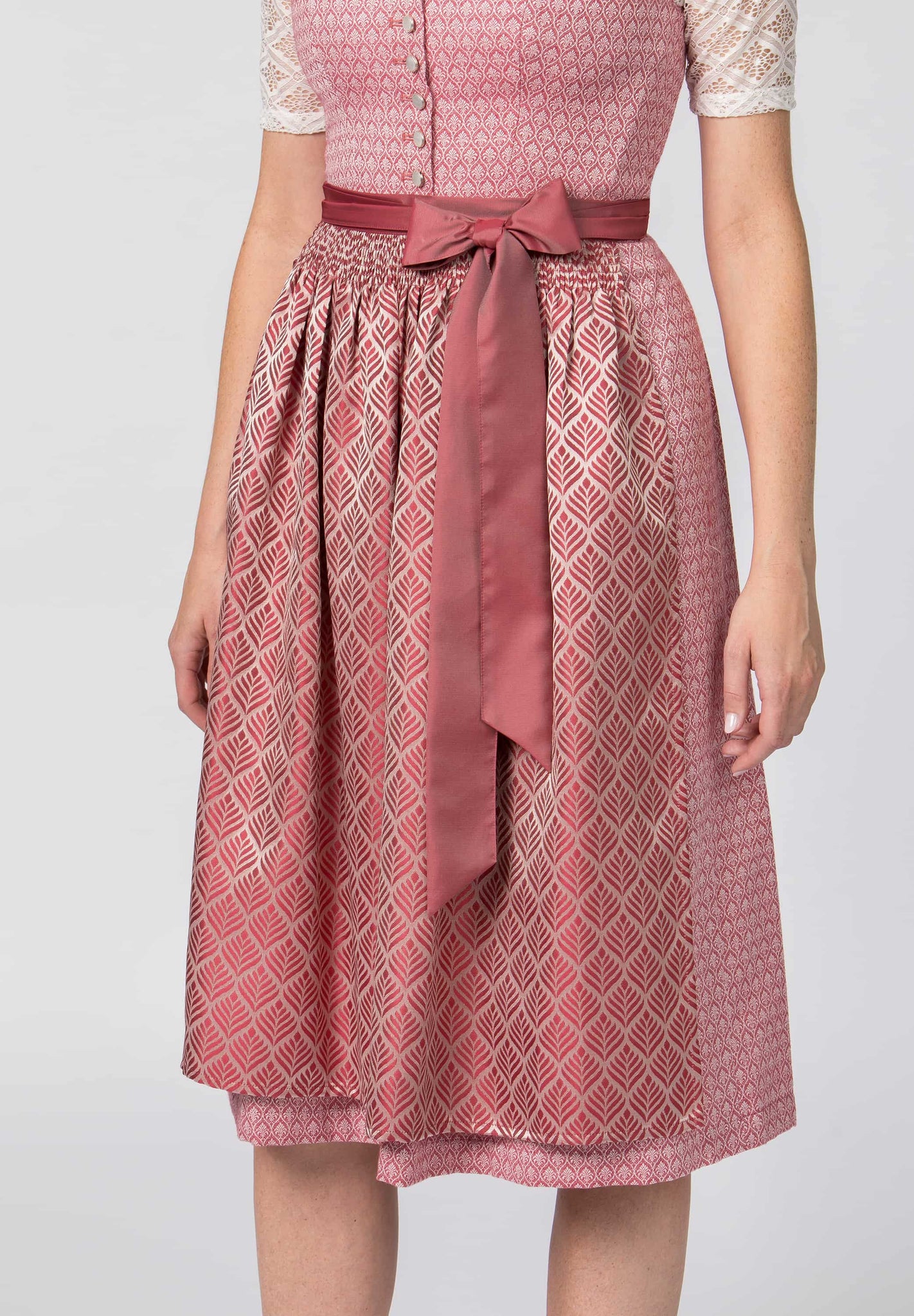 The Daniela dirndl by Heimatgwand is a true treasure for lovers of exquisite traditional costumes. This style combines tradition and luxurious design into a stylish statement for discerning women. The slightly generous sweetheart neckline skillfully highlights the décolleté and is further enhanced by an artfully crafted border. Sparkling mother-of-pearl buttons add subtle accents, while boning in the bodice creates a flattering silhouette. Crafted from high-quality jacquard fabric, the Daniela dirndl lends the wearer a unique charm and underscores its first-class craftsmanship. The gathered skirt with a practical inside pocket ensures comfort and understated sophistication. A sophisticated, perfectly color-coordinated jacquard apron completes the design and underscores the dirndl's luxurious character. The Daniela dirndl is the perfect choice for style-conscious women seeking an exceptional garment that combines tradition with modern chic and adds a touch of luxury to any occasion.