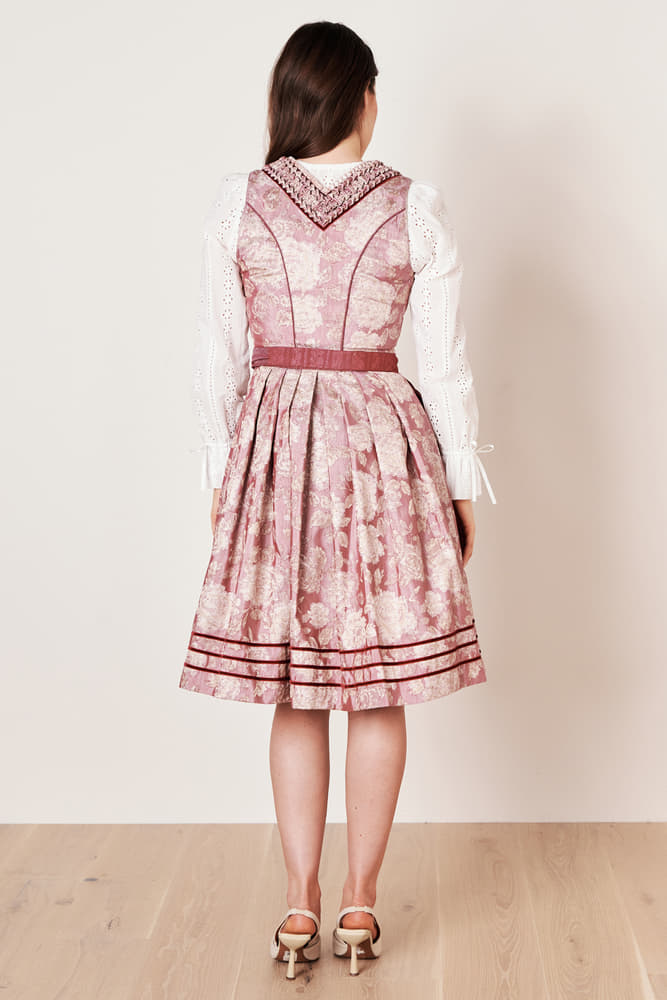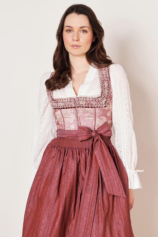 The elegant Dirndl Enrica from our current COLLECTION collection is a real eye-catcher. The fitted cut and the straight neckline decorated with braids flatter your figure. A special highlight is the floral, patterned design on the bodice and skirt, which charmingly covers your knee with a length of 70cm. The two pockets offer you enough space for your essentials. The sleeveless design, together with the straight neckline, gives the Dirndl a classy touch. The zipper on the front ensures a perfect fit. The apron is decorated with fine floral embroidery and rounds off the outfit perfectly. With this modern classic, you will achieve your traditional look perfectly!