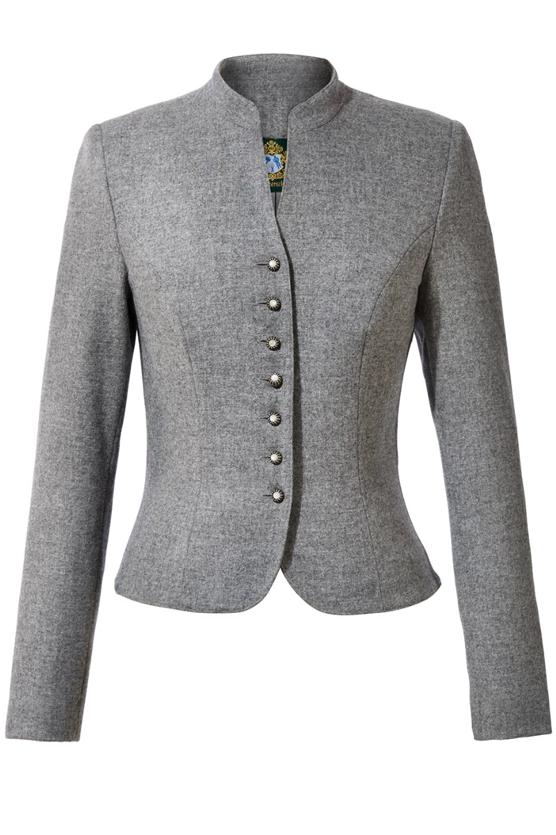 The women's jacket Mallnitz warms not only thanks to 98 % wool, 2 % Elastan content quite wonderful, but also makes every costume outfit perfect. The stand-up collar and beautiful silver buttons make every traditional fan's heart beat faster with this elegant style