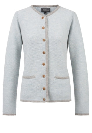 The classy left/left knitted jacket of high quality material with a contrasting edging and strass stone decorated deer antler buttons are a charming focal point.